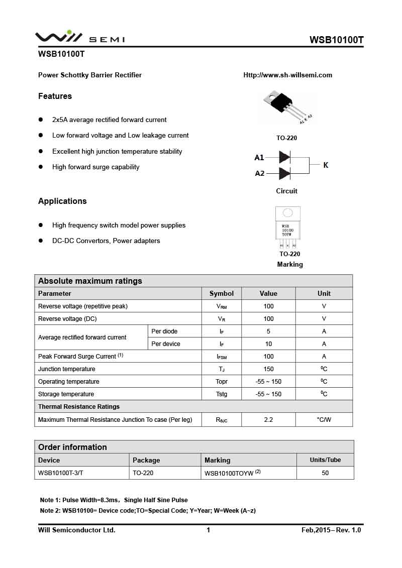 WSB10100T 韋爾肖特基二極管