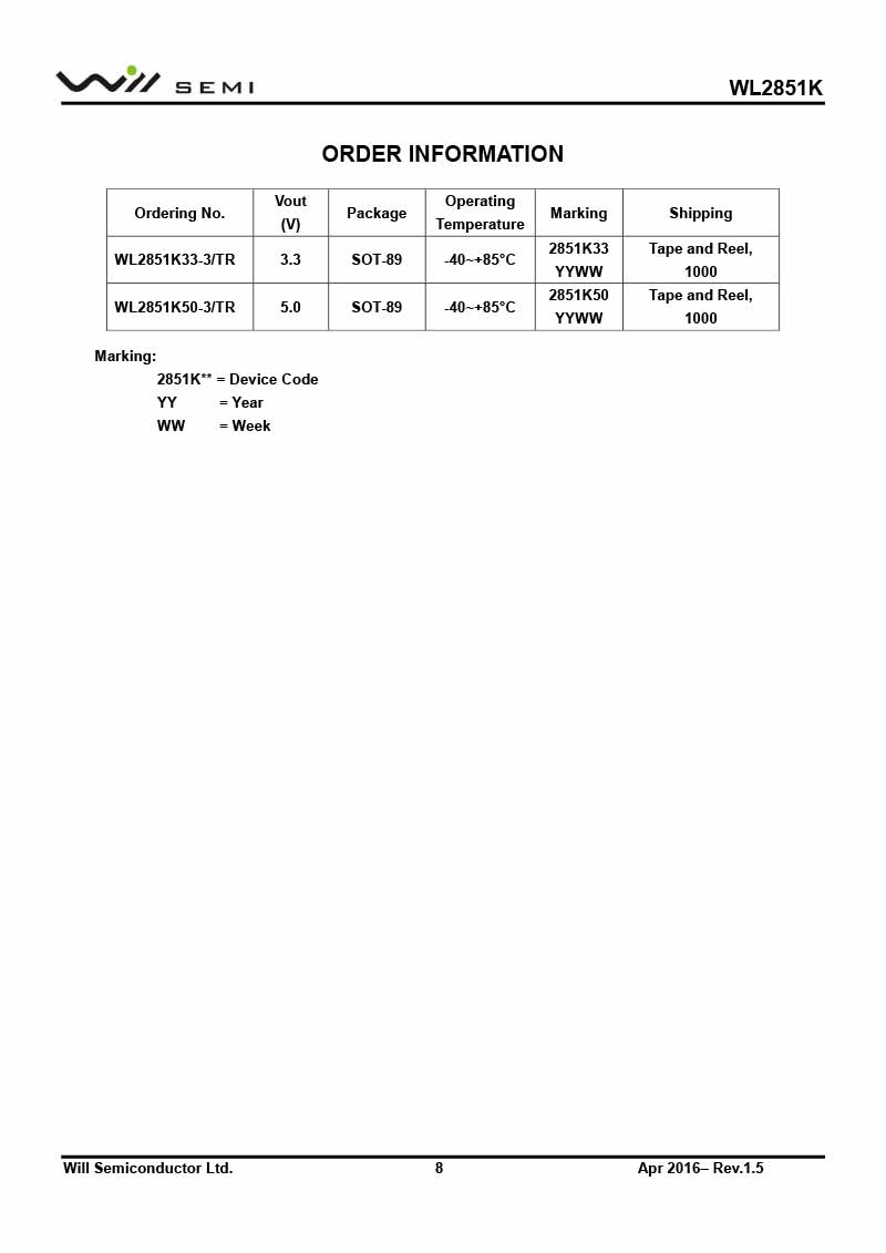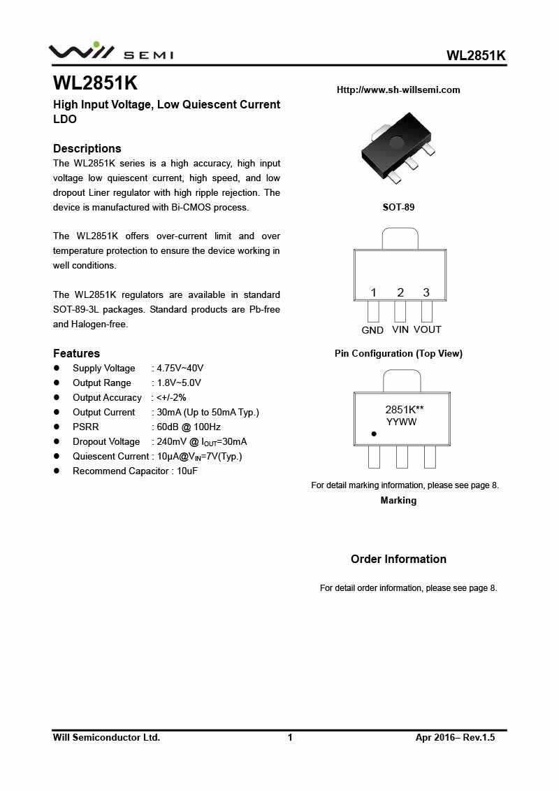 首頁 - 產品中心 - 代理產品 - 韋爾 / WILL -WL2851K 韋爾電源管理LDO