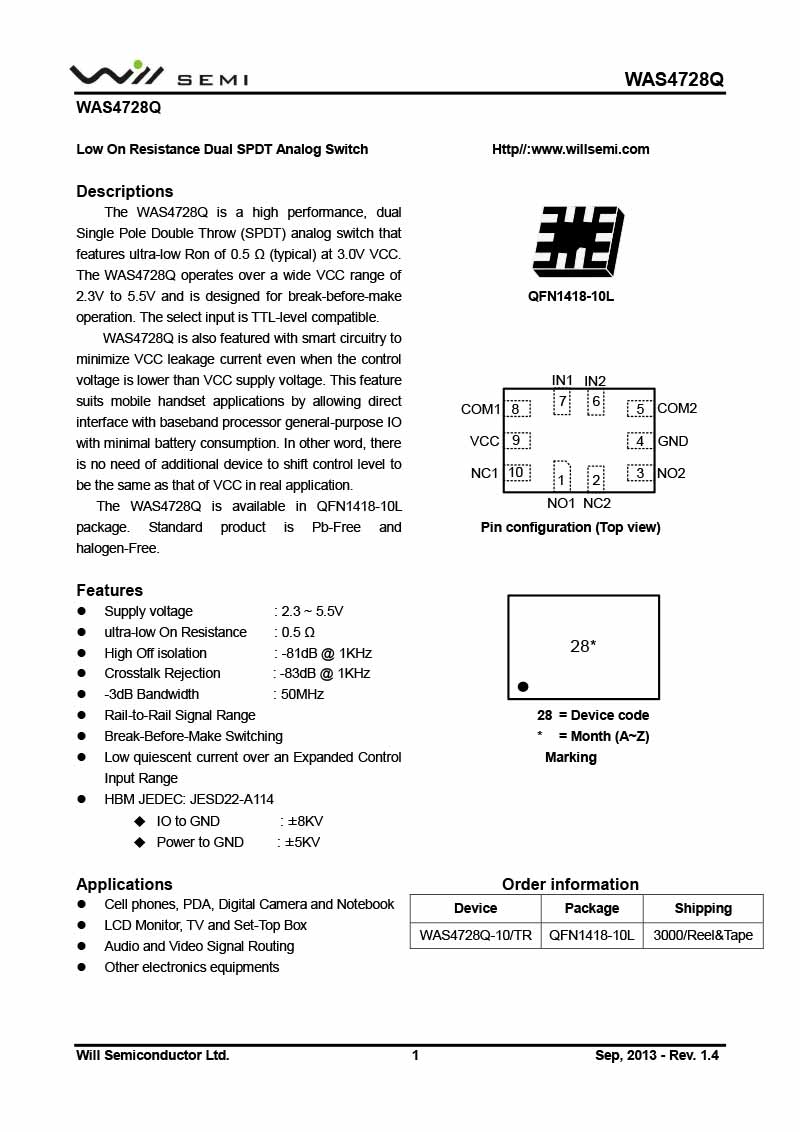 WAS4728Q 韋爾模擬音頻開(kāi)關(guān)產(chǎn)品