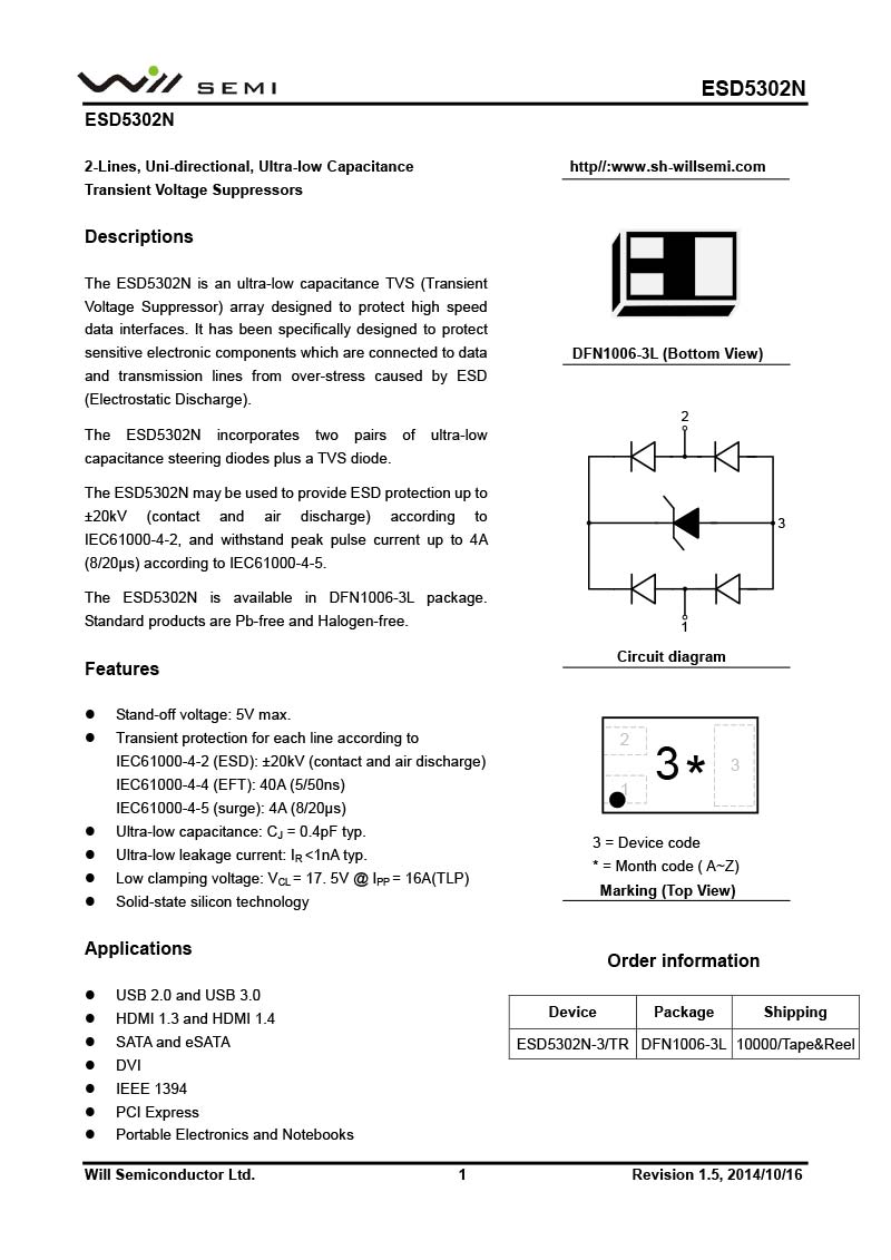 首頁 - 產品中心 - 代理產品 - 韋爾 / WILL -ESD5302N 韋爾小功率靜電TVS