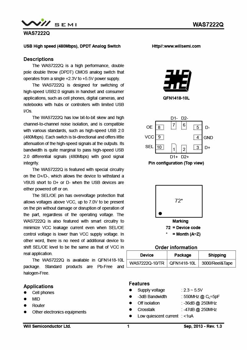 WAS7222Q 韋爾模擬數(shù)據(jù)開關產品